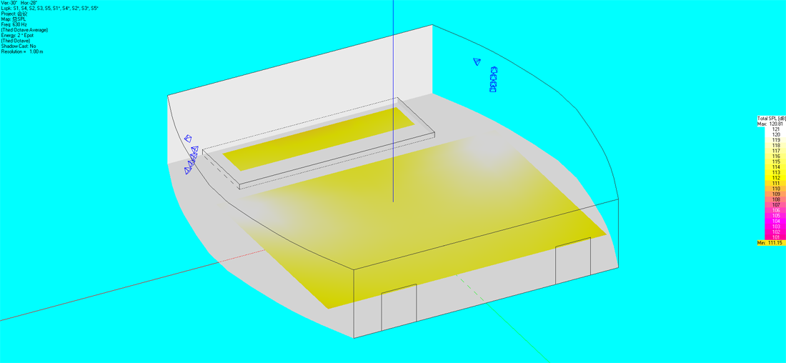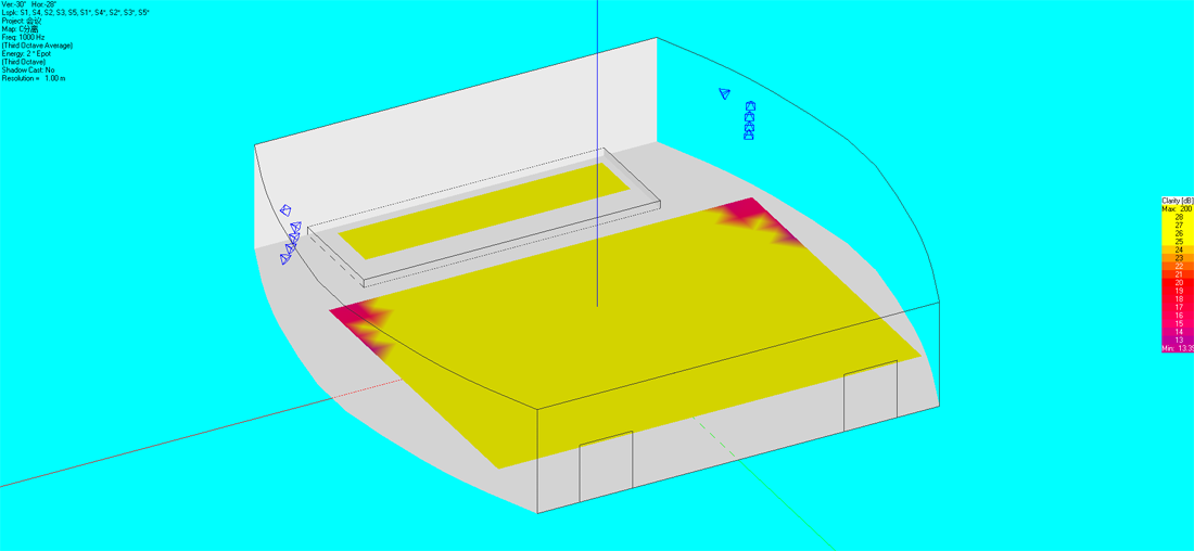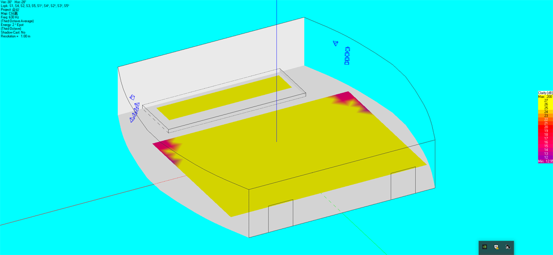 通過初步的設計計算確定黄色视频软件下载的數量和分布,黄色软件app大全免费下载2023這裏選用百威老字號品牌和設備清單上的型號。使用國際聲場模擬測試軟件EASE建立數學模型,將所選的黄色视频软件下载參數功率代入模型,通過聲場設計軟件,模擬計算相關聲學參數。根據行業標準測試結果令人滿意,聲場聲壓與聲場清晰度的測試結果均優良。